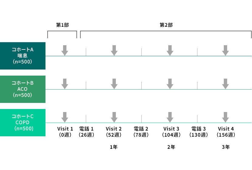 TRAIT Studyは、1,500例の閉塞性肺疾患(COPD※1、喘息、ACO※2)患者を対象に、3年間以上の追跡を予定している多施設共同前向き臨床研究です。