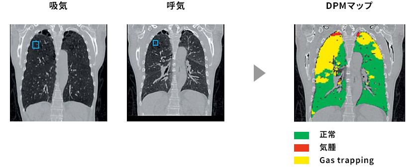 DPMとは、吸気および呼気のCT画像におけるそれぞれのHU値から確率密度関数を用いて気腫とgas trappingが含まれる確率を計算し、マップ化したものである。